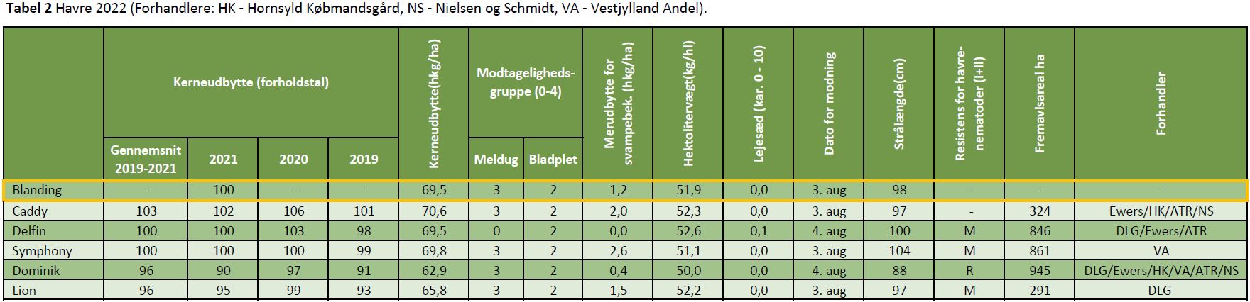Tabel 2 Havre 2022. (Forhandlere: HK - Hornsyld Købmandsgård, NS - Nielsen og Schmidt)