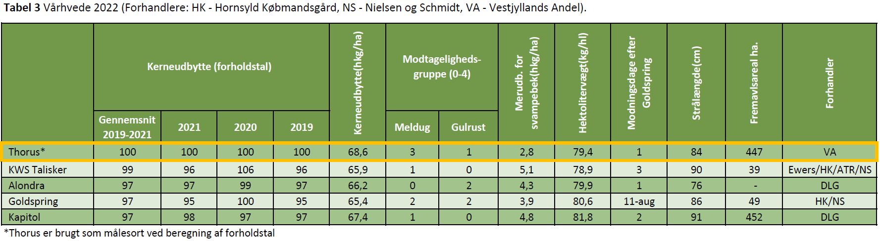 Tabel 3 Vårhvede 2022. (Forhandlere: HK - Hornsyld Købmandsgård, NS - Nielsen og Schmidt)