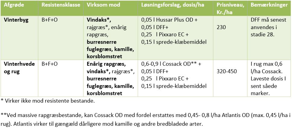I helt ubehandlede marker fra efteråret foreslår vi brede løsninger, med effekt på både græsser og bredbladet ukrudt. Ubehandlede marker sprøjtes ved først givne lejlighed. Og med bredtvirkende løsninger, også resistensmæssigt. Du skal ikke være for nærig med den dyreste komponent (Pixxaro) - Det hævner sig!