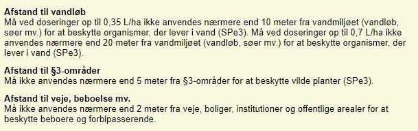 Efter Miljøstyrelsen har overtaget indberetning og kontrol med sprøjtejournaler, er der kommet større fokus på, om det, der står i sprøjtejournalerne, er korrekt og ajourført. Desuden kommer der generelt flere restriktioner på etiketterne som eksemplet i fig. 1. Her kan afstandskravene til vandmiljø og §-3- områder nedsættes ved brug af afdriftsreducerende teknik i yderste træk, mens afstandskravet til veje, beboelse mv. ikke kan nedsættes. Hvis du bruger 90 % reducerende teknik på alle marker, kan du opfylde dokumentationskravet for afstandskrav til vand og §-3 ved at udfylde Miljøstyrelsens bilag 3 med en tekst om, at skemaet omfatter alle behandlinger i den givne sæson. Find skemaet her.