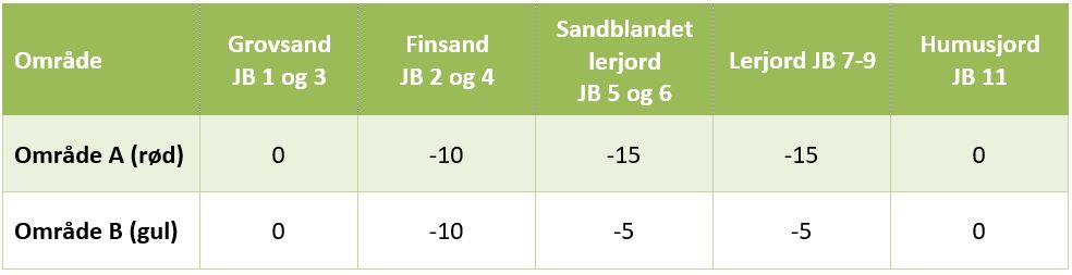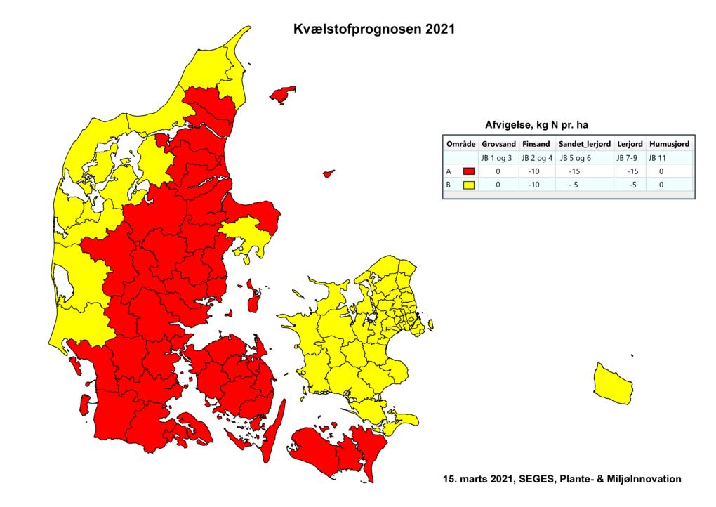 Tabel 5 Kvælstofprognosen 2021. Afvigelser fra det normale behov for tilførsel af kvælstof, kg N pr. ha. Område A og B er vist på kortet og i kommunetabellen.