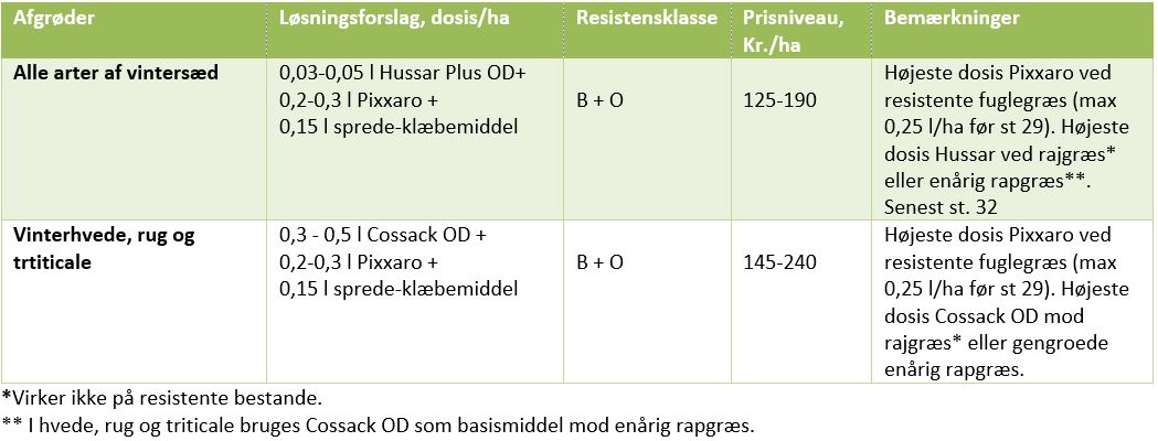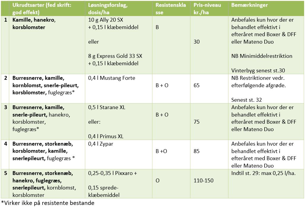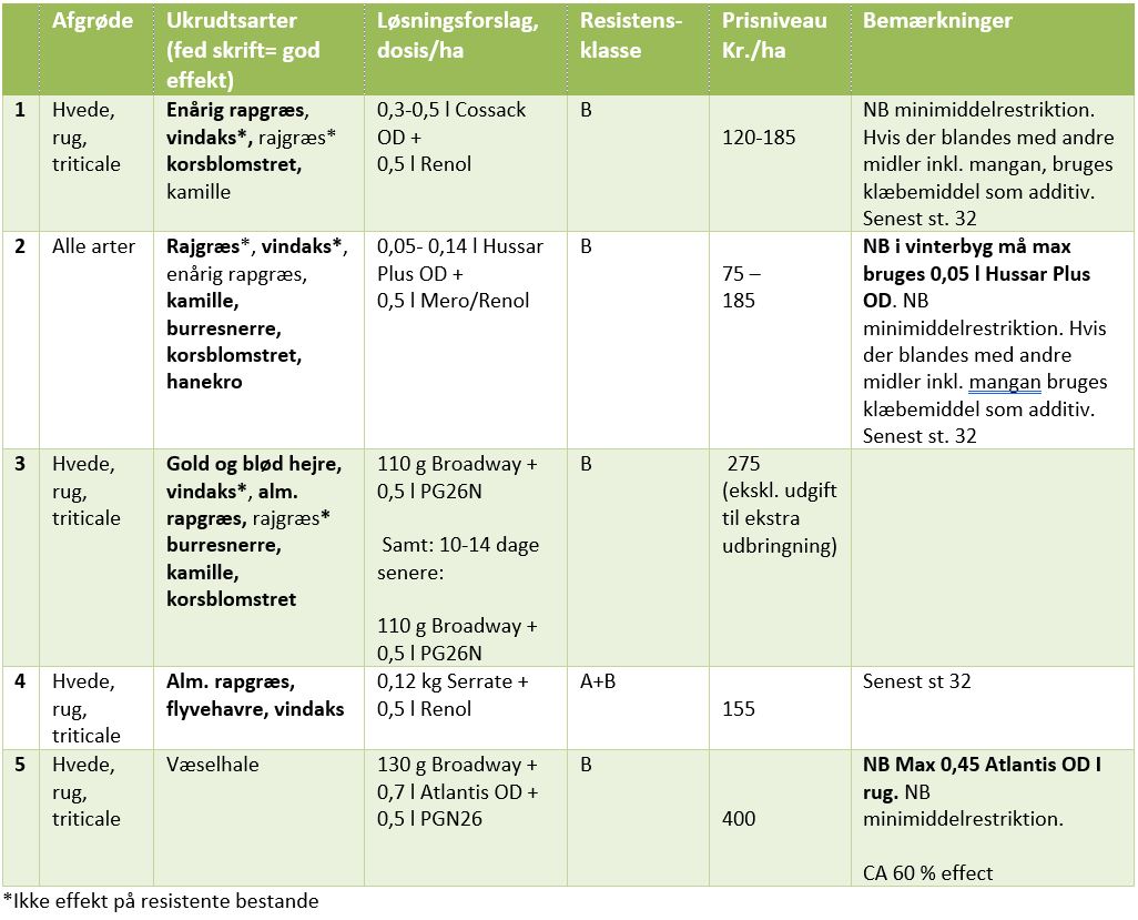 Udgangspunktet for tabellerne er efterårsbehandling med Boxer/Roxy, DFF/Legacy eller Mateno Duo. Hvis der er godt ryddet op fra efteråret med midler tilhørende disse resistensgrupper (N og F), kan man bruge midler fra resistensgruppe B uden den store risiko.