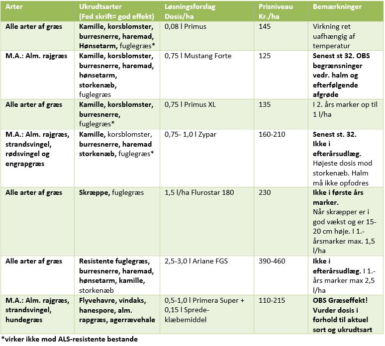 Tabel 4 Ukrudt i frøgræs. Priser ifølge middeldatabasen. Bemærk at nogle midler er til mindre anvendelse (M.A.)