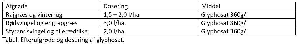 Efterafgrøder af græs kan destrueres efter en mild periode når græsset er kommet i vækst. Det kan være allerede i februar, men kan sagtens vente til først i marts. Destruer med glyphosat eller jordbearbejdning.