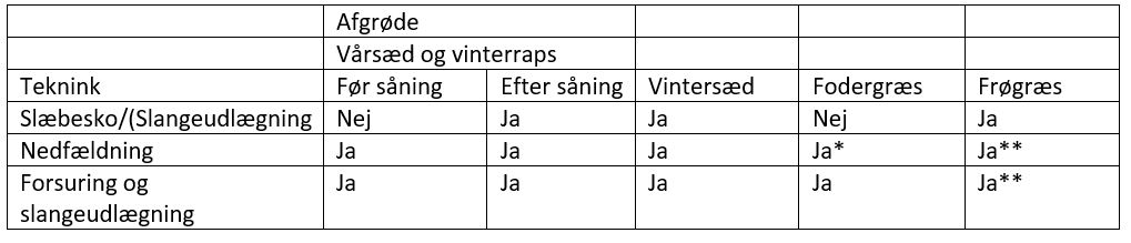 Tabel 2. Oversigt over tilladte udbringningsteknikker til flydende husdyrgødning.