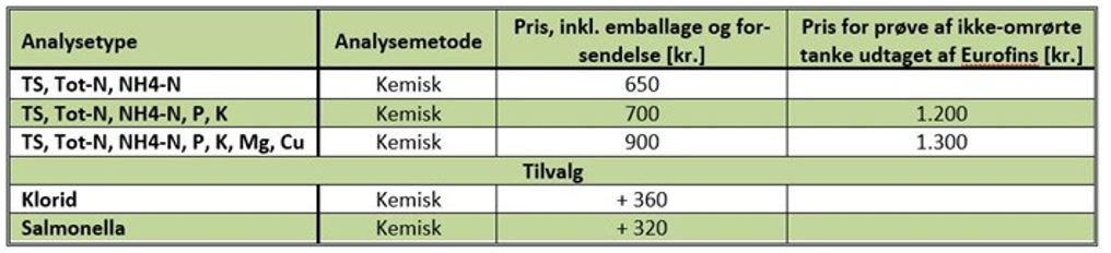Tabel 1 Priser på forskellige typer af gylleanalyser, som tilbydes hos SAGRO. Priserne er inkl. bestilling, emballage, forsendelse og udsendelse af analyseresultater.