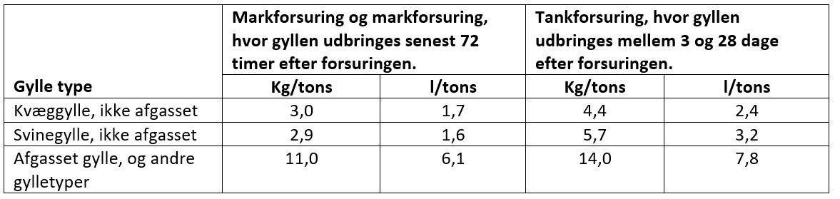 Ved forsuring er der krav om en fast mængde svovlsyre 96%. Se tabel 1. Bruger du en anden type, f.eks. Acidline fra Dan-gødning, skal der tilføres tilsvarende mængde svovlsyre.