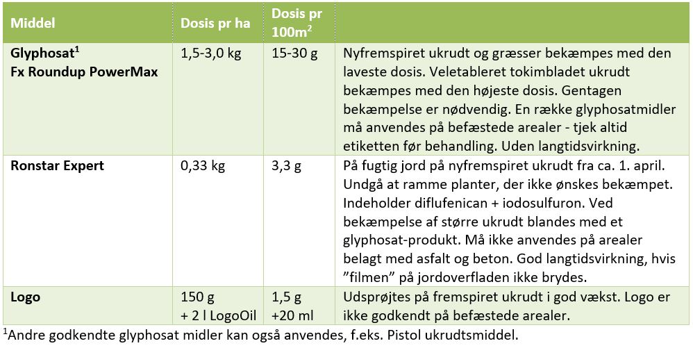 Tabel 1 Midler og doser til ukrudtsbekæmpelse på befæstede og udyrkede arealer. Læs altid etiketten.