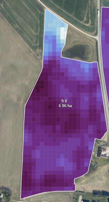 Billede 5 Vinterhvede mark, hvor svampemidlet er omfordelt med CropManager ved 150 L vand. Mørke områder tildeles mere og lyse områder mindre. Ved lavningen hvor afgrøden er tynd, skrues der helt ned på 120 l/ha. I praksis ville man nok manuelt lukke helt for sprøjten, hvis afgrøden er helt væk eller næsten helt væk.