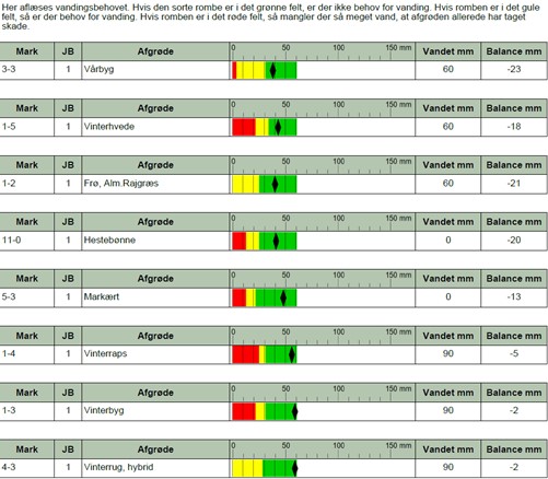 Vintersæd, vinterraps, frøgræs og vårkorn har fuld fordampnings potentiale nu på op til 5 mm pr. dag. Hestebønne og ærter tæller med i vandregnskab, når afgrøden dækker en tredjedel af jorden.