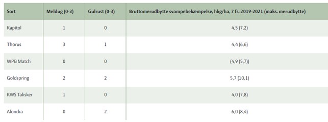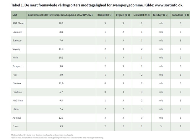 Tabel 3 De mest almindelige vårhvedesorters modtagelighed for svampesygdomme. Kilde: Sortinfo.dk