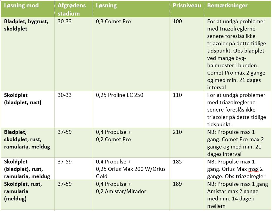 Skoldplet: 10 % angrebne planter og 5 dage med over 1 mm indenfor de seneste 14 dage. Optællingen starter i st. 31 (1. knæ fremme) i sorter med karakteren 2-3 i tabel 1.