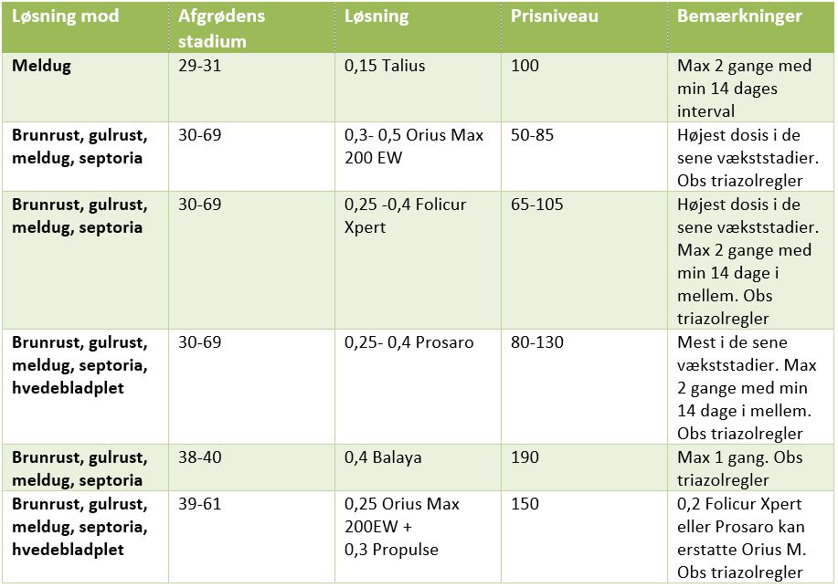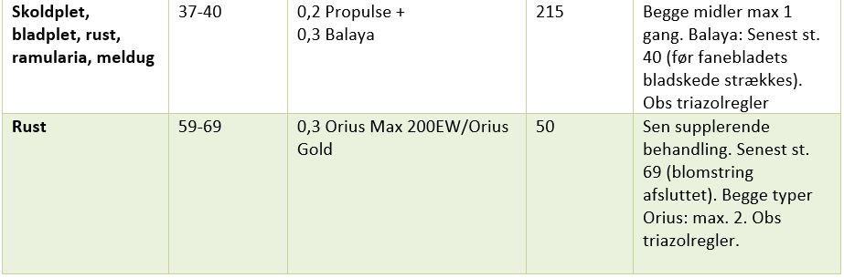 0,3 Orius Max 200 EW/ Folicur Xpert / Proline Xpert/Prosaro/Proline er gode meldugløsninger i havre. Der kan tilsættes 0,2 Comet Pro eller Propulse, hvis der også ses bladplet.