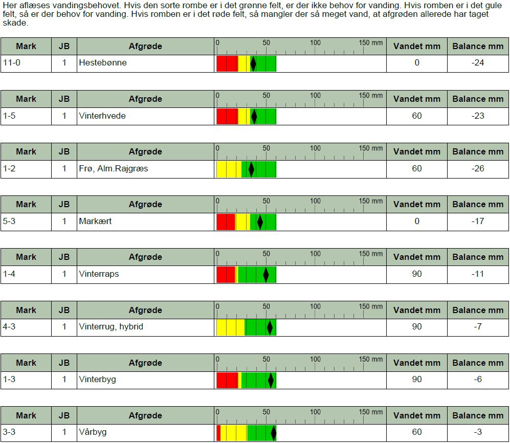 De afgrøder, der står højest i prioriteringslisten, er de afgrøder, der har størst behov for at være vandforsynet. F.eks. kan hestebønne kun undvære 45 % før den går i det gule felt, mens vinterrug kan tåle at mangle meget vand. Se figur 1.