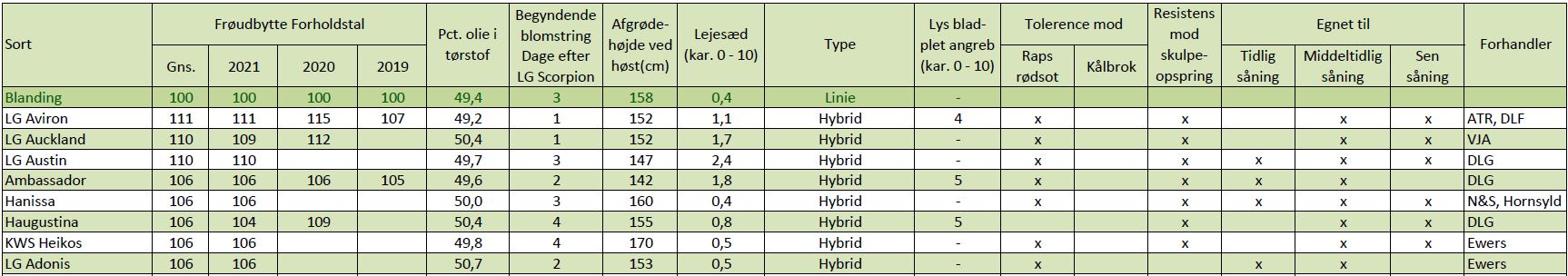 Højdespringerne på udbytte er tre sorter fra LG; LG Aviron, LG Auckland og LG Austin med forholdstal på udbytte mellem 109 og 111 for 2021. Sorterne Hodysse og PT299 der ligger på et forholdstal på 104, har det højeste olieindhold på henholdvis 51,4 og 51,7 i 2021.
