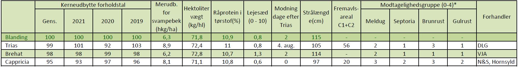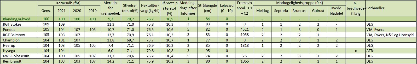 Udbyttemæssigt ligger sorterne RGT Stokes, Pondus og RGT Bairstow i top. (RGT Stokes er udsolgt i denne sæson, men indgår i en sortsblanding). Af disse er kun Pondus testet i tre år. RGT Stokes er ny og RGT Bairstow er med for andet år i træk. Proteinindholdet er højest i brødhvedesorterne KWS Extase, SU Fiete og Bright. Bright er den eneste sort med ganske lidt lejesæd med karakteren 0,3 for lejesæd, mens de øvrige ligger på karakteren 0 (max er 10).