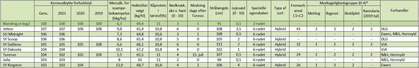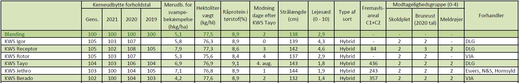 Hybriderne Jettoo og SY Galileo ligger stabilt i toppen og har gjort det i flere år. Særligt SY Galileo modner tidligt og har relativ lave sygdomskarakterer. Sorterne med højeste fremavlsareal, og dermed størst udsædsmængde ligger i bunden udbyttemæssigt, og det kan derfor være en fordel at være hurtig hvis man ønsker en af sorterne med lavere fremavlsareal.