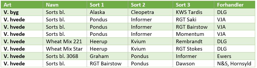 Der tilbydes i år en række sortsblandinger af hhv. vinterbyg og vinterhvede. Især er udvalget af vinterhvede vokset og det er da også der de største fordele er. Se blandingerne i tabel 6.