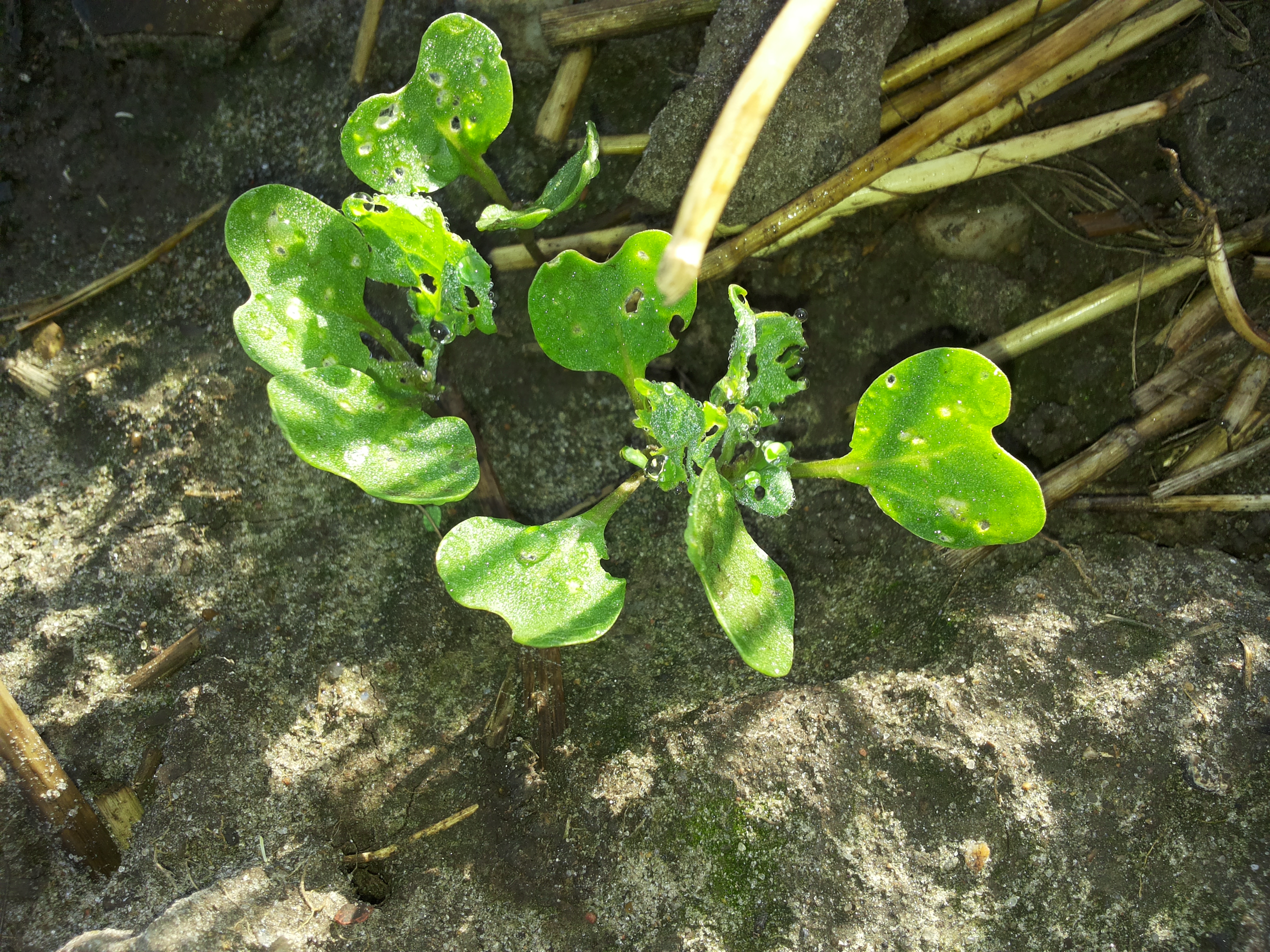 Billede 1 Rapsplanter med gnav af rapsjordloppen. Til forskel fra gnav af snegle kan gnav af rapsjordlopper genkendes på de små huller midt på bladpladen (Foto: Jens Peder Pedersen, SAGRO).