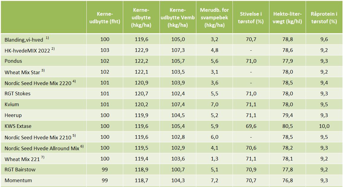Tabel 2 Høstudbytter og kvalitetsparametre i vinterhvedesorter og blandinger afprøvet i landforsøgene 2022. Kilde: Sortinfo.dk