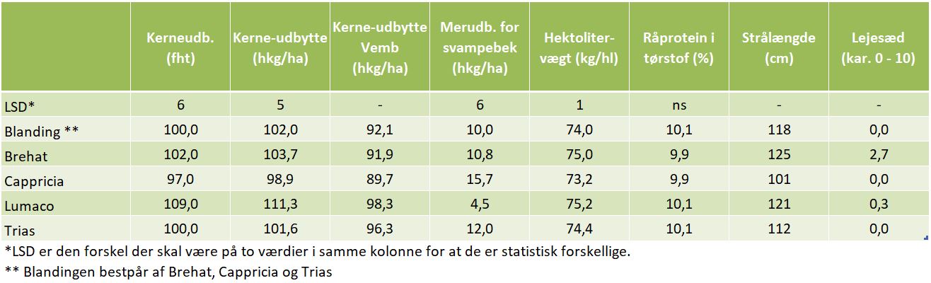 Sortudvalget af triticale er begrænset på grund af det lille marked for triticale. Sorten Lumaco har vist et højt udbytte, et godt stykke over blandingen og de øvrige sorter som vist i tabel 3.