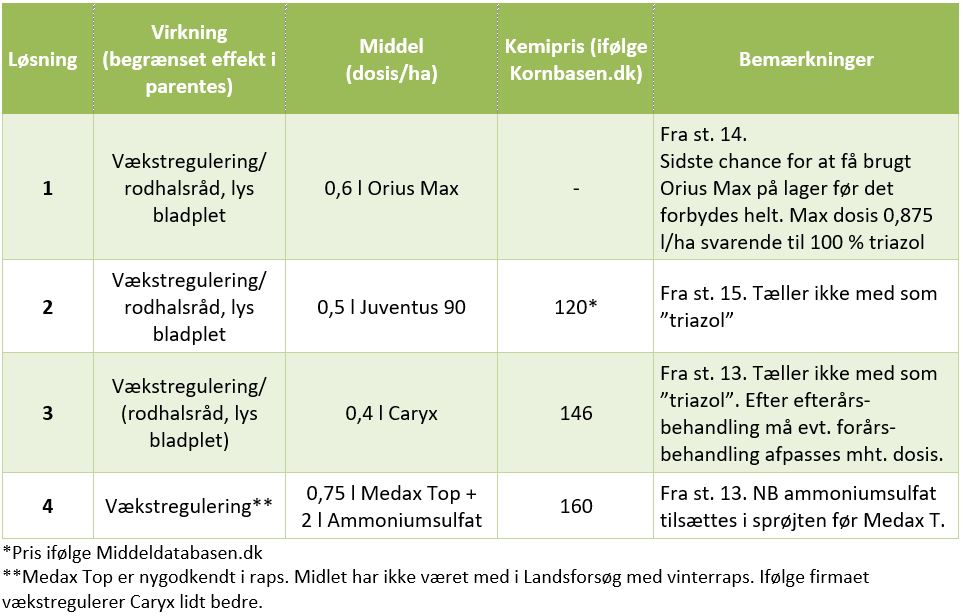 Hvis man har ”gamle” triazoler som f.eks. Orius Max, Folicur Xpert eller Prosaro EC 250, som alle forbydes helt pr 31.12.2022 på lager, kan disse bruges i raps i dette efterår. Vækstreguleringseffekten er bedst dokumenteret i forsøg for Orius Max, derfor er de andre udgående triazoler ikke med i tabel 1. Obs alle triazoler bortset fra Juventus 90 tæller med i ”triazol-regnskabet”.
