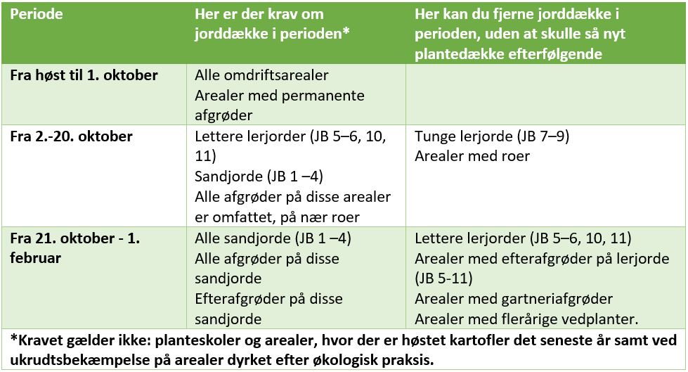 Tabel 1 Oversigt over perioder med krav om jorddække, afhængig af jordtype og afgrøder.