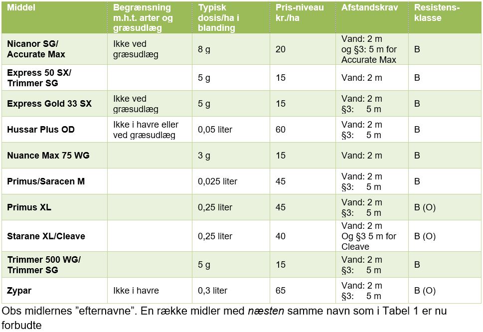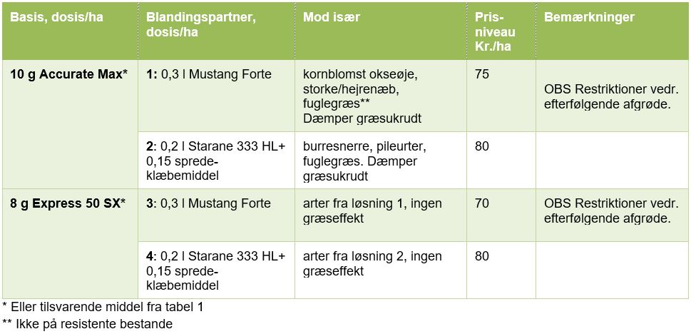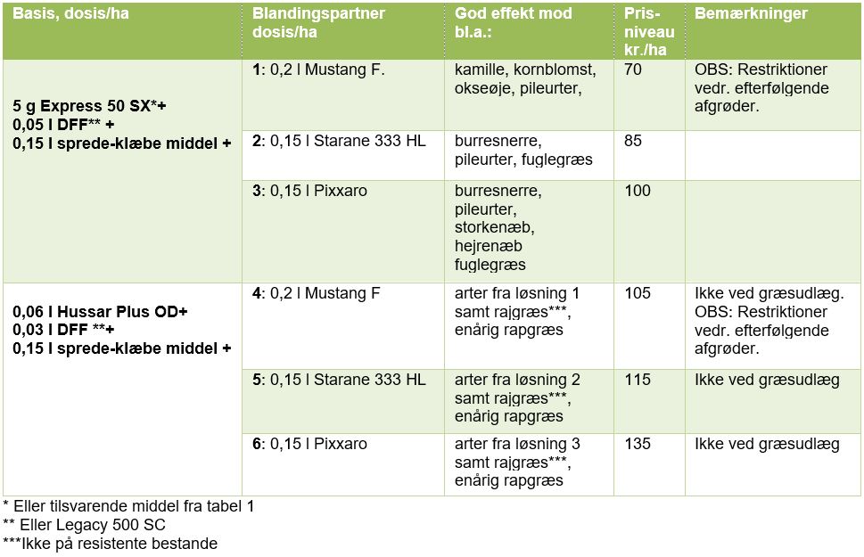 Valget af minimiddel i blandingen afhænger mest af, om der skal bekæmpes græsukrudt eller ej. Skal der ikke det, kan man fint vælge det billigste middel fra tabel 1, som ”basis-middel”. Nicanor/Accurate og Express Gold dæmper enårig rapgræs, men det er Hussar Plus OD, der bruges målrettet mod græsukrudt.
