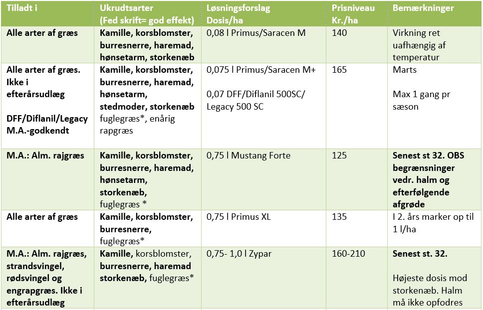 Tabel 4 Ukrudt i frøgræs. Priser ifølge middeldatabasen. Bemærk at nogle midler er til mindre anvendelse (M.A.)