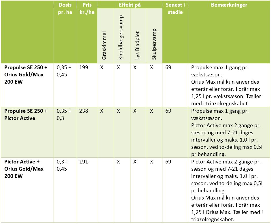 Se løsningsforslag i tabel 1. Der er taget udgangspunkt i Propulse SE 250 og Orius Max 200EW, som også kan bruges i korn.