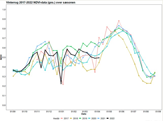 Figur 2 Biomasse i rug. Bemærk biomassen i år (den sorte kurve) er først begyndt at bevæge sig opad først i april. Kilde: SEGES