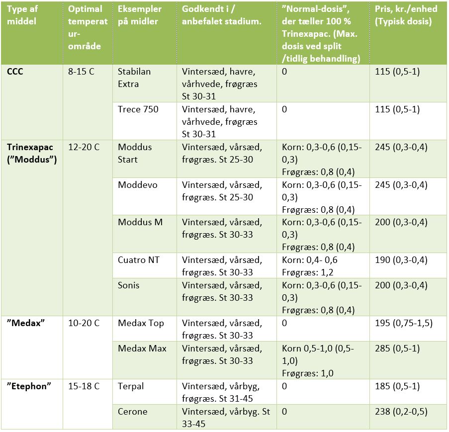 Tabel 2 Oversigt over vækstreguleringsmidler til vintersæd og frøgræs. Obs at der for mange midler er restriktioner for splitbehandlinger: lavere tilladt dosering end ved enkeltbehandling, og et givet minimumsinterval. Priser ifølge Middeldatabasen.dk.