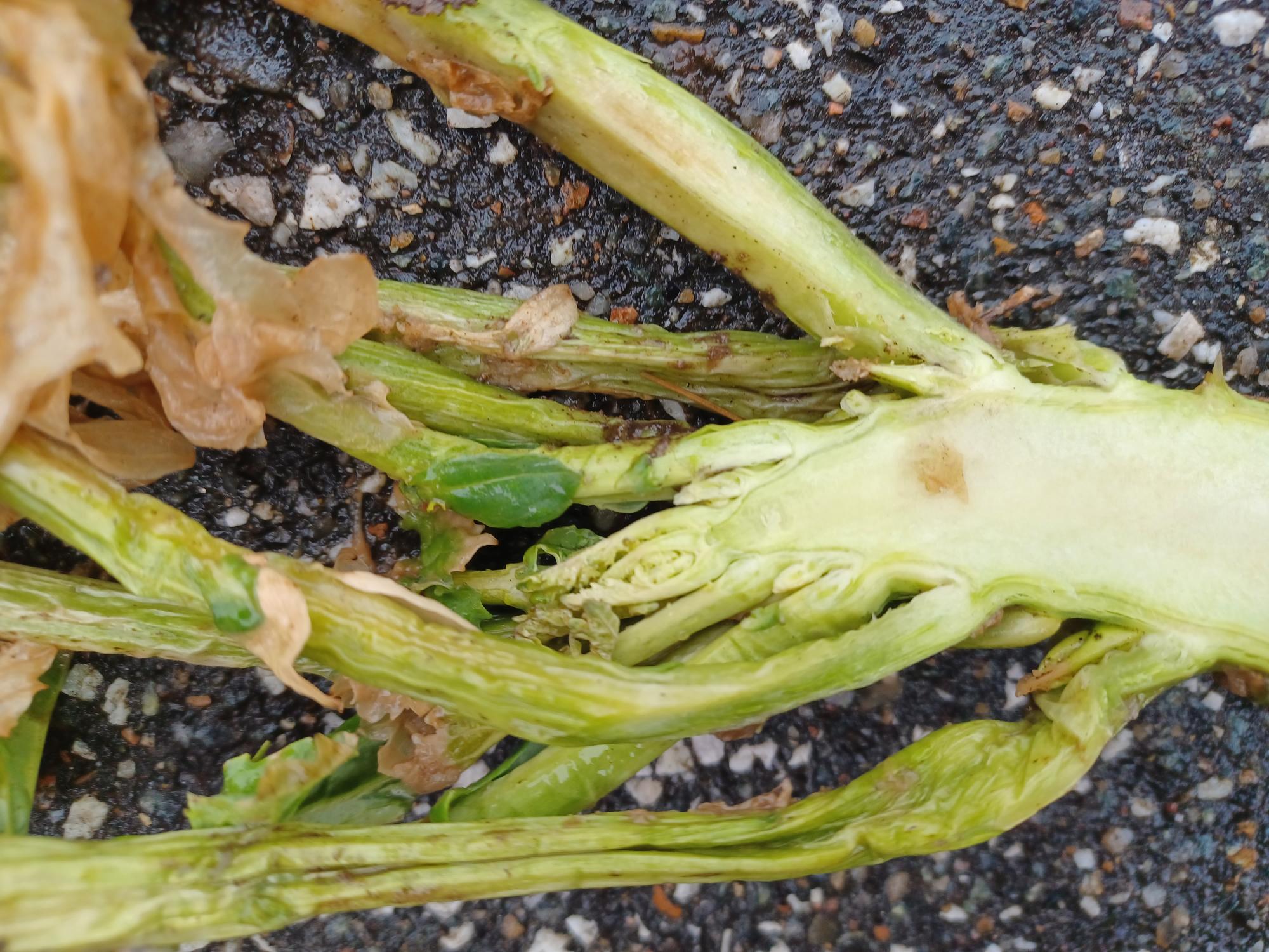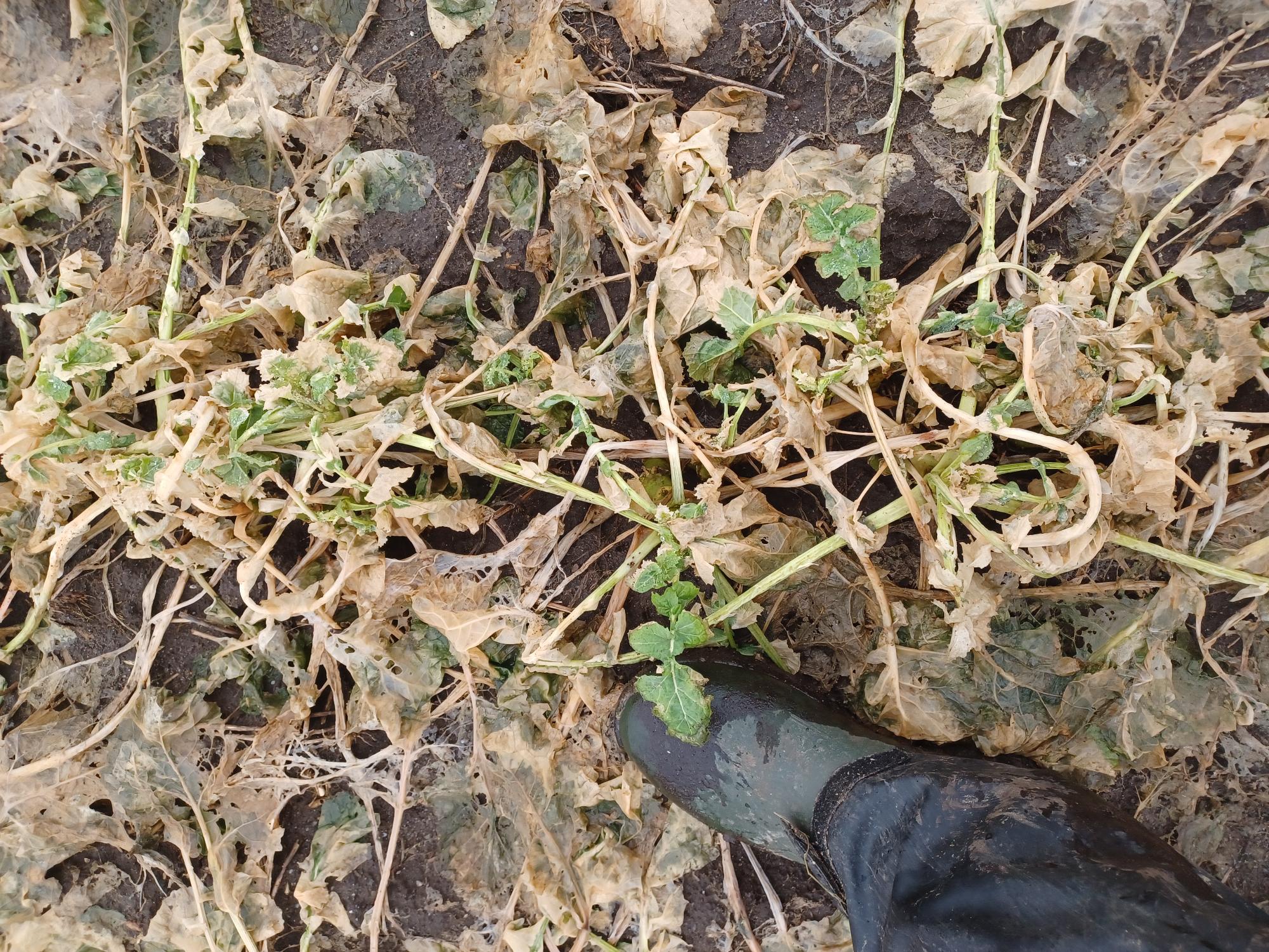 På billede 2, 3 og 4, ses vinterrapsen efter vinterens påvirkning. Bladene er stor set afløvet, men rod, stængel og vækstpunkt ser fine ud.